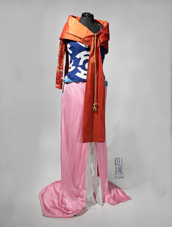 In November ’03 I found a really cool orange fabric, shot through with gold for the shawl. I made the shawl without a pattern, and interfaced the shoulder parts so they would stand up on their own. The back of the shawl has pieces hanging down which I painted the designs on – they’re hard to see but they are there! I should have wired them to make them stick out away from my body a little more.