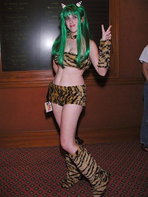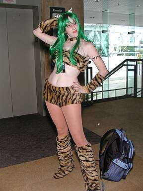 I started out by buying a two piece swimsuit that had the shape I wanted at Target. I found this tiger stripe fur at the local fabric store, and covered both the top and the bottom in the fur (using the swimsuit pieces as a basic pattern for cutting the fabric). I glued it on in spots so it would still stretch, and hand-stitched it in a few important places.