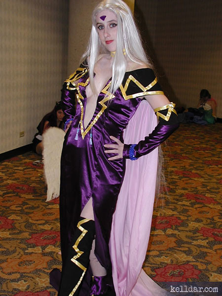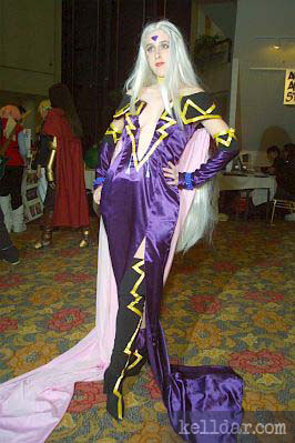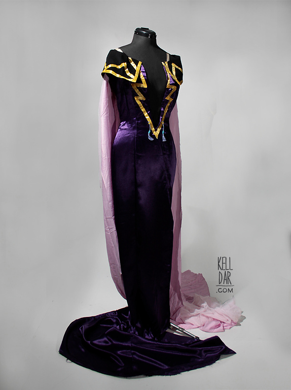 I decided to go with this purple satin for the dress, and used an evening dress pattern for it, adding the plunging neckline, the train in the back, and the collar. The hardest part about this was the deep cut in the front – I never actually tried this on completely before the convention, so I’m lucky everything worked. The yellow zig-zags were done with yellow ribbon, the tassles I bought, dyed and added the beads to, and then sewed on.