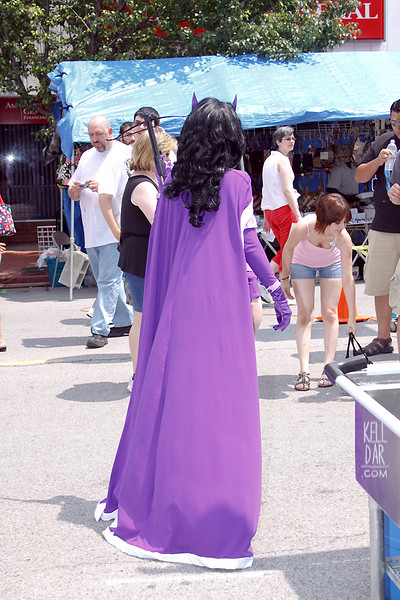 The boots I bought online and made boot covers for out of my purple fabric. The belt was a belt blank dyed lavender, it snaps in the back. The belt accessories were all just random pieces found in the junk drawer that were painted and attached. The armbands and legbands my husband made using resin pieces, painted and attached to elastic. The crossbow was bought online and taken apart (to not be functional), and for the gloves, I made the upper section, then bought a pair of wrist-length gloves on ebay and dyed them to match (so I could take off just the hand section instead of the whole contraption if I needed to. Also I did not feel like making gloves!)