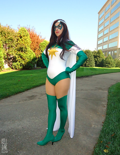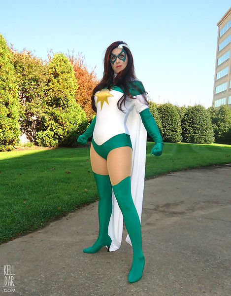 I used white and green spandex; the white is doubled over so it’s not see-through. I hand-sewed the starburst (gold spandex) onto the front, then machine stitched it in place. Collar closes with hook-and-eye, scarf is stitched in front and snaps closed in the back.