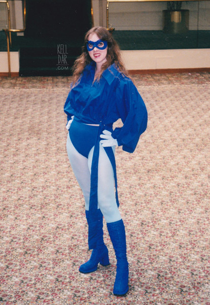 The mask was fun to make. I heated up some friendly plastic and formed it to my face, then covered it in my left-over blue cotton, and added ribbons so I could tie it on behind my hair. It’s not the most elegant thing, but it does fit my face very well. It took about 20 years but the mask finally broke đ At least when I rewore this in 2013, I replaced it with a latex mask, so I’m glad it wasn’t my only mask at that point.