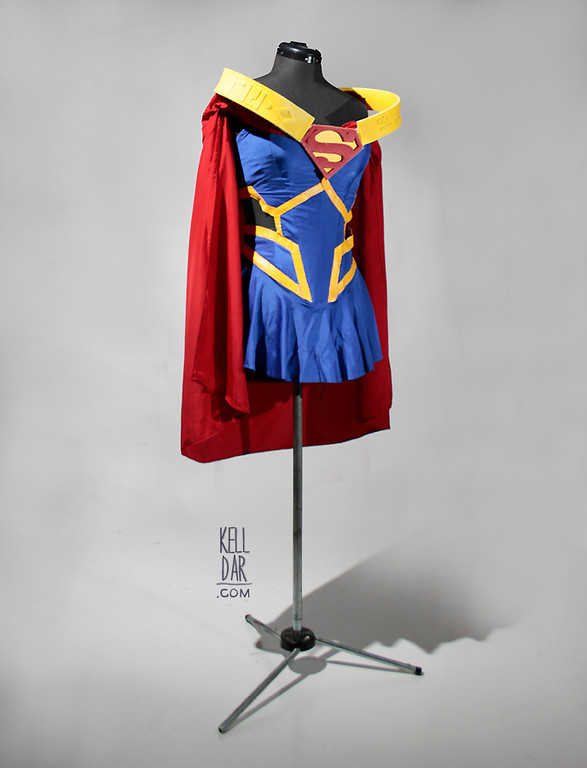 My husband made the shoulder wrap piece (foam), and the “S” symbol. We couldn’t find an S symbol small enough, so he carved it out of foam. It snaps onto the bodice, and the shoulder pieces velcro to it. The cape is stitched onto the front of the bodice, and velcros to the inside of the shoulder wrap along the back.