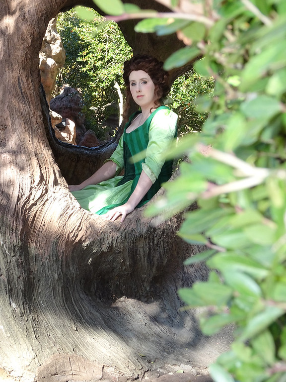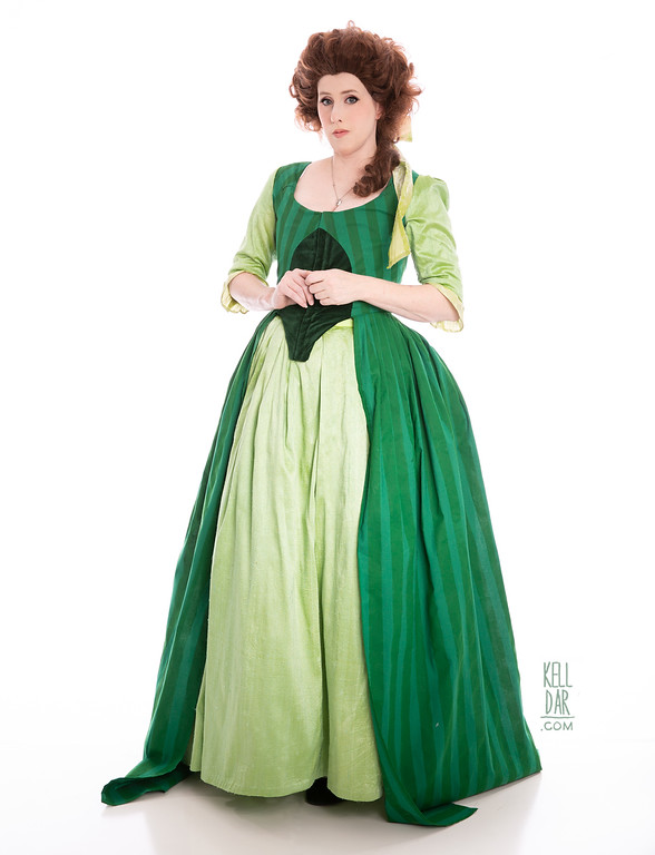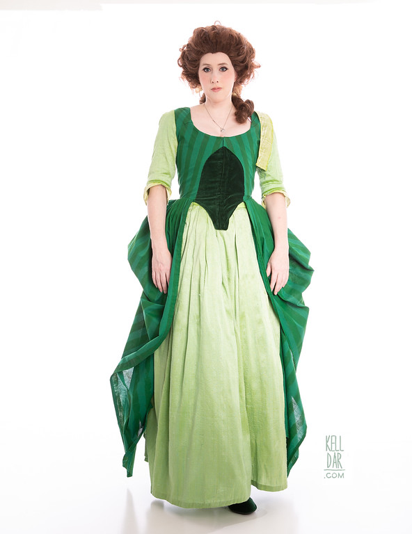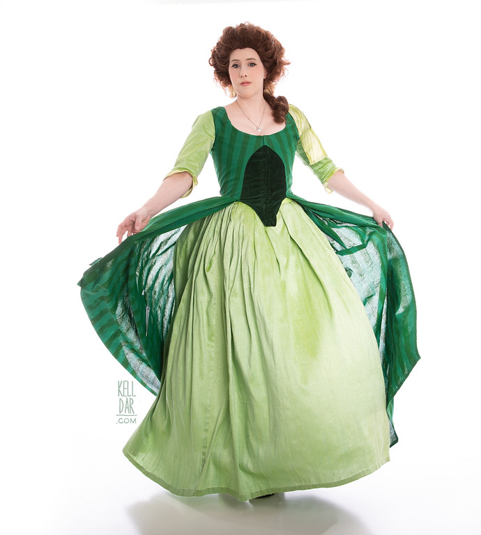 After Dragoncon 2018 I got obsessed with the idea of making a Robe à l’Anglaise with green-on-green stripes. That’s really all I wanted. Green stripes. I decided I could do it as a historical version of Belle’s library dress, to be a companion piece to the pink historical version I did of her “Something There” dress in 2015. I drew it up, started fabric shopping and… couldn’t find green on green stripes ANYWHERE. Literally months of searching and the only green-on-green I found was an ugly knit. It was so ugly I didn’t even keep the swatch and I usually keep all swatches LOL. I also tried dyeing a white-on-white stripe but the dye took differently to the sections so that wouldn’t work.