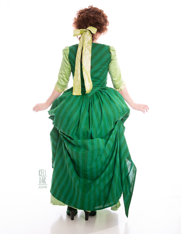 Once those were assembled I got them basted in, then machine-sewn in. Last little bit was to put in bustle lines… I used some scrap ribbon, sewn onto the interior side of the skirt, and snaps at the waistline it can connect to.