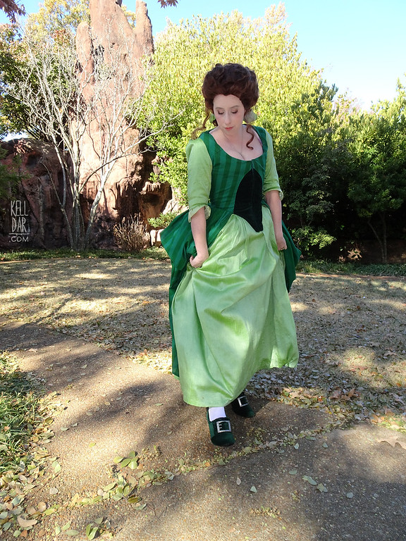 I guess I need to talk about the shoes, huh? I found this air of shoes at the secondhand store, $10. They were super cute, fit well, and I liked the shape a lot. Only thing was the heel was too high. But I decided to let that slide because they fit everything else I wanted. Originally, I was going to paint the shiny parts white and cover the rest in my scrap green velveteen. But after painting those sections without much success, I realized the white was going to look shocking with the rest of the costume. So I scrapped that idea and decided I’d cover those sections in leftover dupioni. After a mockup of that I realized that also looked weird – and everything I was trying to do was coming across more 20s than 1700s. So I decided let’s just cover the whole shoe in the green velveteen and use the dupioni for accents.