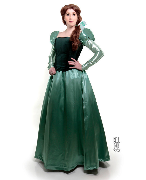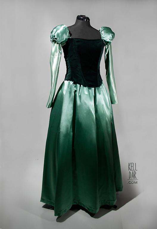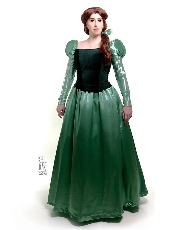 I picked up a dark green velveteen for the bodice, and ended up using satin for the skirt and sleeves – not exactly what I wanted, but there was really nothing else I liked in our local stores. I used a pattern for the basic bodice, added the boning and a cotton lining layer, and it laces up the back. The only trouble I had with the whole thing was the puff sleeves – I got them to where I thought I liked them, but when I got to the convention and tried it on – the “poofs” were totally lopsided. I didn’t wear it, took it home and started over on them. Took them off the dress and re-sewed them on, and also added some additional straps just in the back to sort of “shore” them up and keep them in the right place.