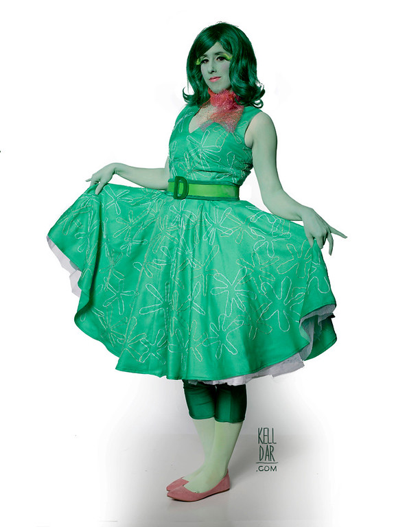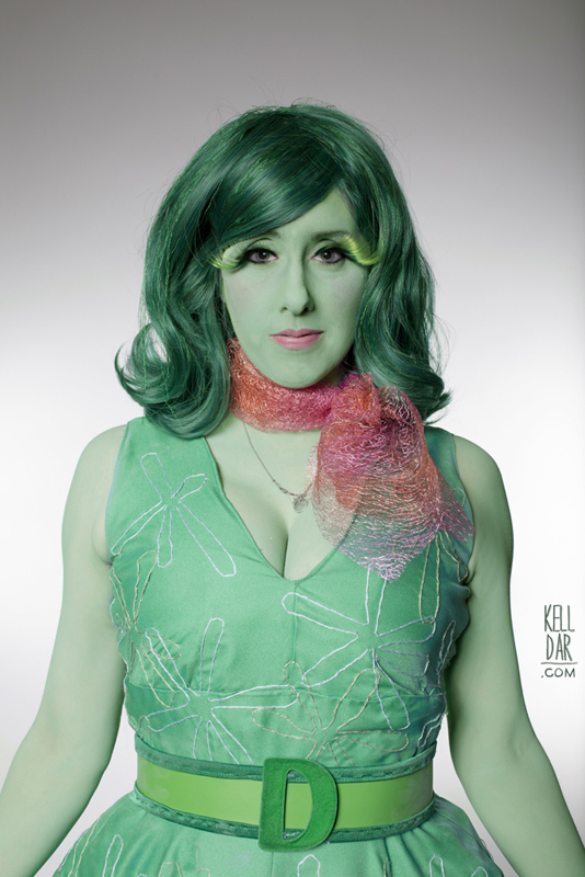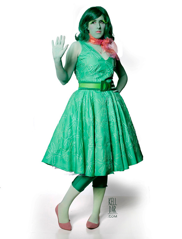 The wig is an Arda Vivien in dark green. It’s a little darker than I should have gone with, but I really really love the colour. I trimmed it, and added 2 skeins of metallic green embroidery floss to the wig cap. The embroidery floss didn’t really work out as well as I hope – it was very easy to thread and tie into the wig cap, and it looks great when the light is directly hitting it, but otherwise I feel like it’s too subtle. I may go back and add tinsel like others have done for their Inside Out wigs.