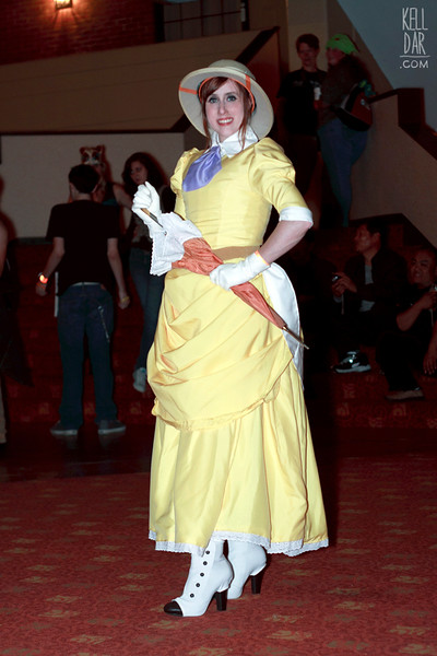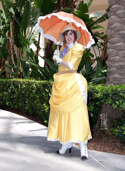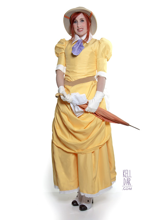 The gloves were my Hoth Leia gloves. The boots I bought online and made spats (white knit fabric) for. (And, much like the hat, these boots have also fallen apart since I made this!! Ugh! The soles came off.) and the parasol I bought at an estate sale – I grabbed it because it had a nice wooden handle and I thought it would be a good base. I was going to rip the fabric off and re-cover the frame with my yellow fabric, but in the end decided to leave it, mostly because I was running out of time (and feeling lazy…) I did hand stitch lace to the edge and clean it up as best I could.
