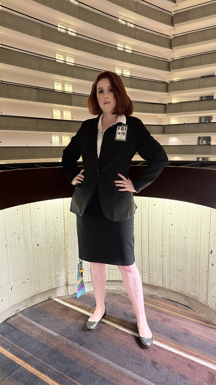 I decided in summer 2023 I really needed an easier to wear, simple costume for late night because at that time, my line-up was very heavy on the uncomfortable costumes. I was rewatching X-Files at the time and realized I could throw together a Scully costume pretty easily.