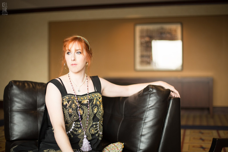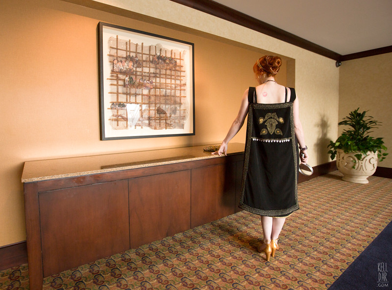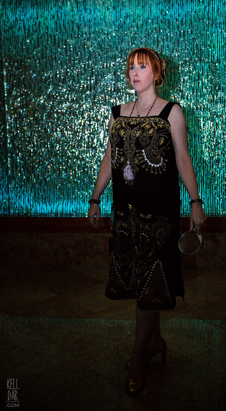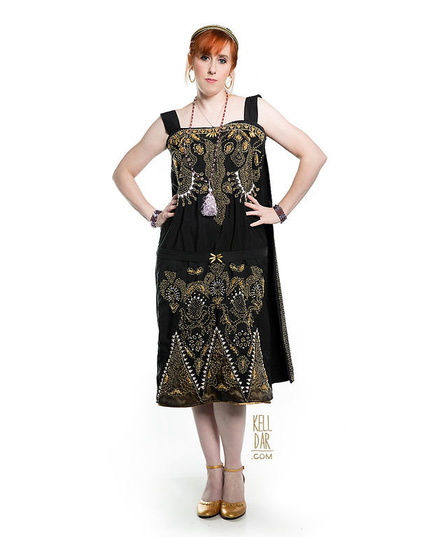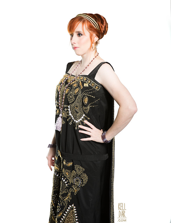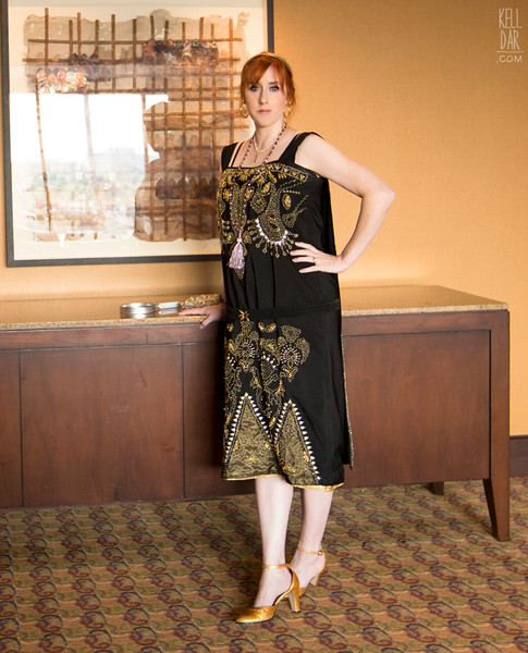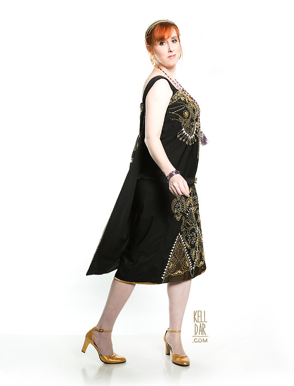 I picked up these heels at the second hand store last year. Thankfully they hadn’t gotten stuck in a box and lost in the interim, they were still sitting in a bag in my sewing room! I repainted them gold. Unfortunately they are possibly the second most uncomfortable costume shoes I’ve ever worn, the entire inside is covered in moleskin to try to ward off blisters. Which sucks because otherwise this costume is SO comfy! I’ve got to replace them one of these days. The clutch is one that belonged to my grandmother, and the fan was given to me by my other grandmother. I ended up buying, like 4 different headbands for this project – I ended up using two of them, and adding an additional chain of rhinestones to the end of one to wrap into my hairbun.
