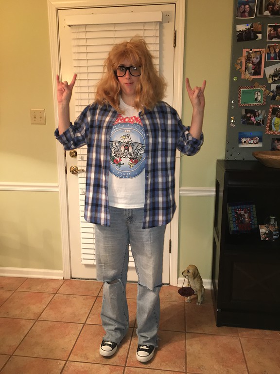 The button up shirt I bought on ebay, and the Aerosmith shirt I bought on etsy – we found a seller who did Garth’s shirt, Wayne’s shirt and Wayne’s hat as a bundle and just bought that. And much like the shoes, the shirt is now assimilated into my regular wardrobe. I wore it home from dragoncon Monday morning.