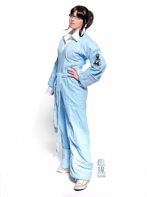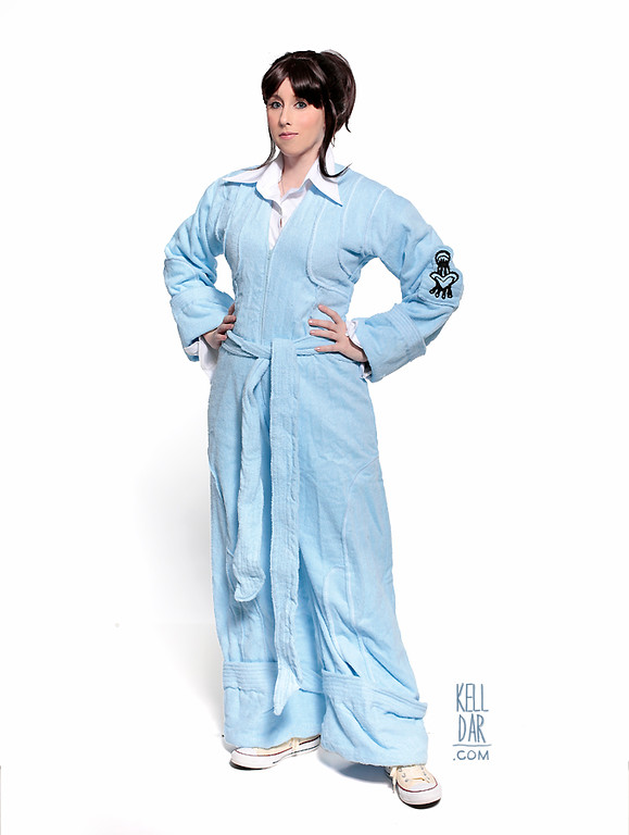 For Trillian, I used a “mascot”/animal costume pattern. I started out by making it out of plain blue cotton, fitting and making seam alterations to that, and then using that as my pattern for cutting out my blue terry cloth for the main part of the costume. I also used the cotton as lining for the suit, hoping that would help slow down the process of the terry cloth unraveling. I used white thread and a very small zig-zag stitch on all of the pieces, again, hoping to keep everything together as long as possible, and also to help the seams stand out a bit more.