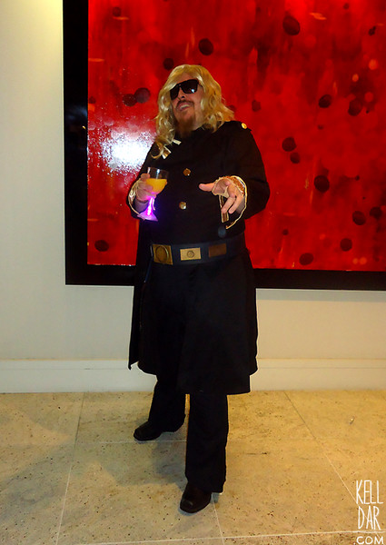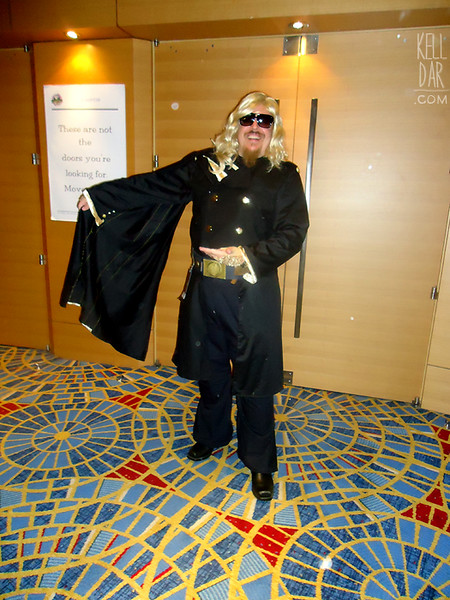 For Chase’s Zaphod costume, I used a “Mad Hatter/Pirate” costume pattern, and I really only altered it to change the collar and add the “cape” piece. The fabric I picked for this attracts every single piece of lint and thread in a 100yd radius, which was awful since I was also working on numerous things I was using white thread for, not to mention the white feathers for Romana! Anyway, we bought a pair of pants online and I altered them. For the gloves, I made a fingerless glove out of nude spandex, and hand-stitched some chains onto them (I did not want to pay for chainmail gloves). We bought the sunglasses and wig online. He made the belt out of leather and cast the belt buckle pieces.