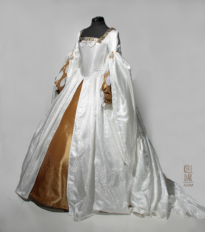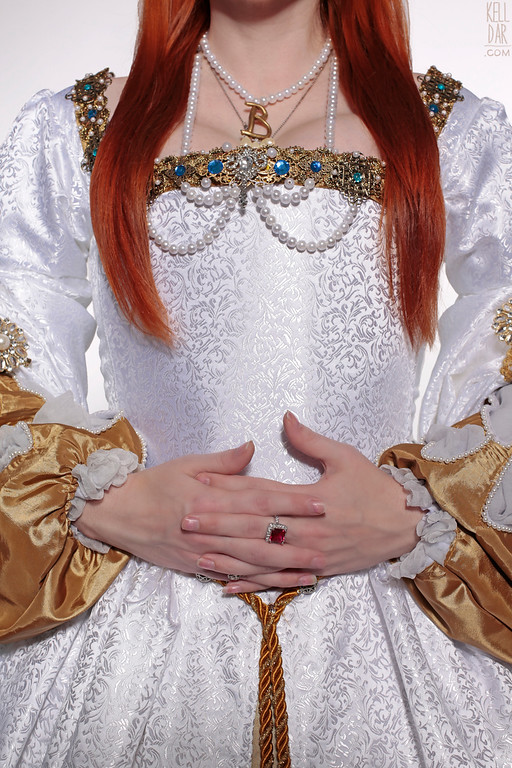 The undersleeves are made of the gold taffeta as well. They were an adventure. I used the Simplicity pattern piece, enlarging it and changing the shape a bit. I interfaced them for some support, cut each slash out and faced it, and then added the pearl trim around each one. They were the most work-intensive part of the whole costume – especially since I finished the pearl trim on one sleeve, decided I didn’t like the pearls and removed them and had to redo the whole sleeve with smaller pearls! (The first draft I used loose, large pearls and it just looked too heavy. So I found some smaller light pearls and that worked so much better.) The interior is a silk gauze, which I dyed to be slightly blueish-silvery-grey. Originally I was going to make them removable, but decided I had no reason to ever need to unsnap them, so they are lightly sewn into place in the dress. They could easily be removed for cleaning or if I wanted to replace them – but don’t know why I would want to replace them after all that work LOL.