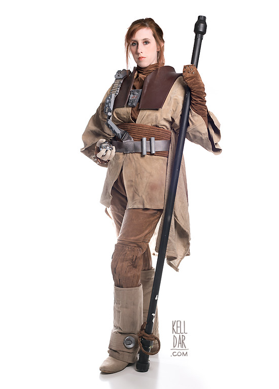 The cummerbund we made using cut pieces of rope wrapped in my suede – it velcros in the back. (as of 2024, I had to make an extension for the back because it doesn’t fit anymore, and it now closes with large hook and eyes.) The blaster my husband originally made from various parts from Home Depot, but over the years and moves it fell apart. For the 2024 white backdrop shoot, he 3d printed new, accurate parts and assembled it for me.