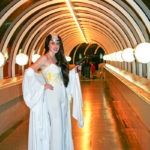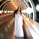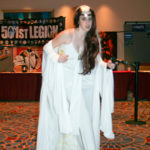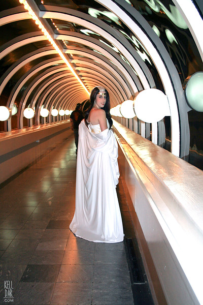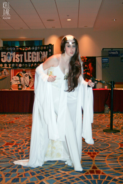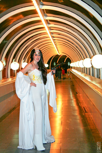 Bodysuit: I bought a white bodysuit to use as a base. I cut off and altered the top, and added clear straps. I ended up building the boots into the suit, which I need to go back and tweak. The “tie” piece I made similar to the one from Amidala’s parade dress. The brooch was a found piece I painted gold. The most time-consuming part of this project was the waist pieces and back “cape/skirt” piece, which are both part of the bodysuit. I made each piece for the waist, then came up with the design and heat-transferred most of it onto the fabric. For the parts I didn’t get, I hand-painted on. Same went for the back cape – which is hard to see in photos.