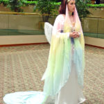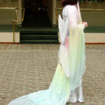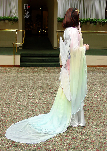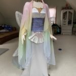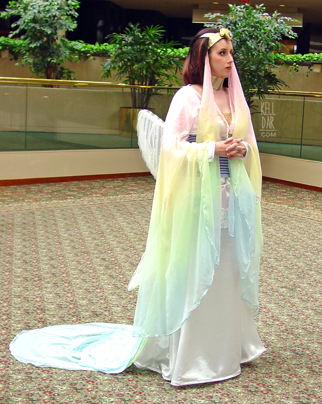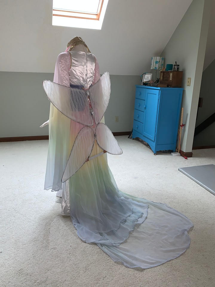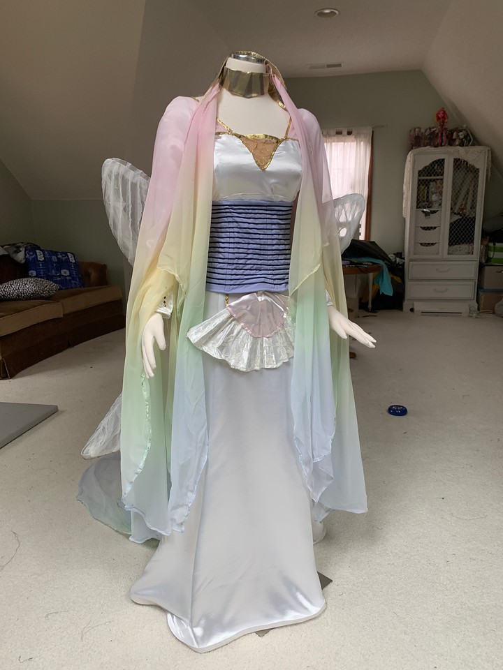 All of the rainbow pieces – the sleeves, the pieces hanging from the tiara, and the multiple trains, were made of poly chiffon and dyed. The trains are all sewn onto the back of the dress below the zipper, and the sleeves are sewn onto the neckline of the base dress.