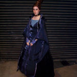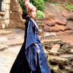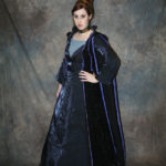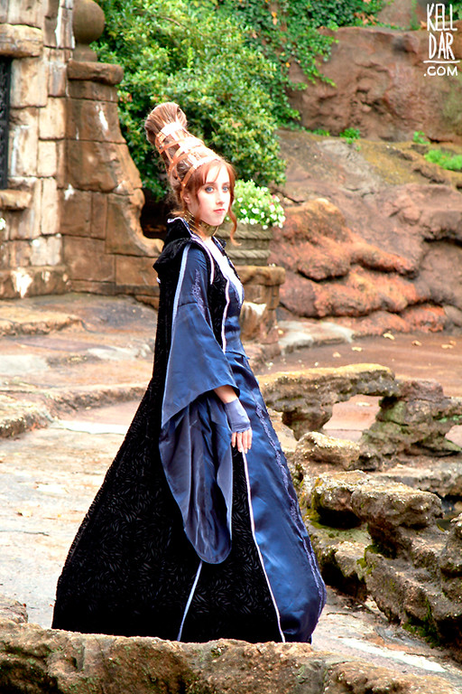 I found a beautiful blue fabric I fell in love with – I used it for the top and skirt. The top zips up the back, and originally I followed the pattern blindly and made huge bell sleeves, which as I realised too late wasn’t right, and didn’t have time to fix them before Dragoncon – I corrected them afterwards. I used sequin fabric for the panel in the front, and lace appliques dyed to match on the sleeves and front of the skirt.