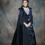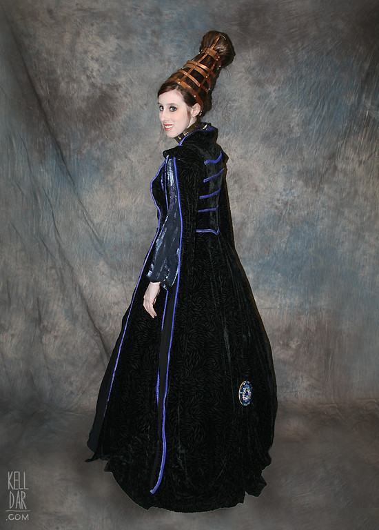 For the outer “jacket,” I think I frankensteined several patterns, probably starting with Simplicity 9891 as a base, using a black burn out velvet for it.. I didn’t have time to finish the “sleeve” part of the jacket, and never did finish it, but I did go back and repaint the trim a darker shade later on.