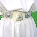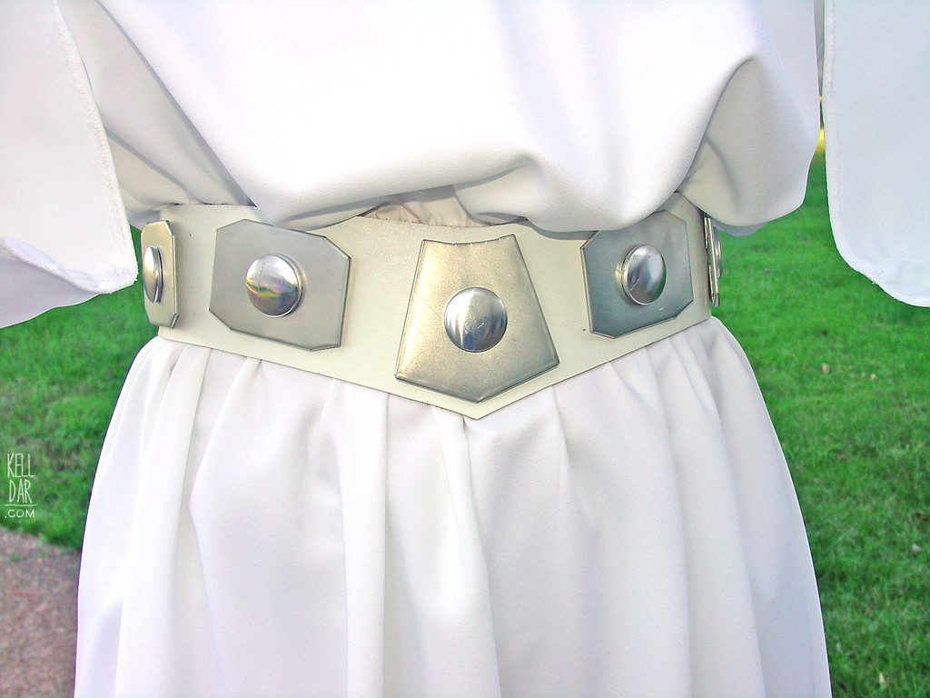 My belt my dad helped me make – we bought a long piece of leather, cut the shape out, and I dyed it white. My dad cut each of the metal pieces out and attached the silver buttons in the center, and then rivetted each metal piece onto the belt. It buttons up in the back. I love it. (And as of 2025, this is still the Leia belt I am using. It has seen better days and I have plans to make a new one eventually, and give this one a long deserved retirement!)