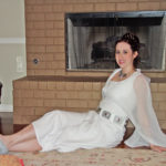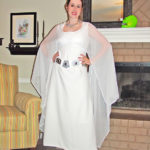 I used a pattern for the main part of the dress, altered to be a tiny bit longer, for adding the sleeves, and for the shape of the neckline. I could NOT find a fabric I liked for it, I ended up using a white crepe-back satin, wrong side out so the shiny side was on the inside. The sleeves were poly chiffon; I did not use a pattern for these, just draped them on my dressform. I did make the dress shorter than it should be due to being out and about outside on Halloween night, and I didn’t want a white train dragging on the ground.