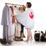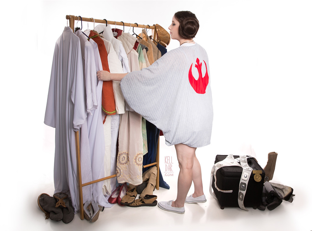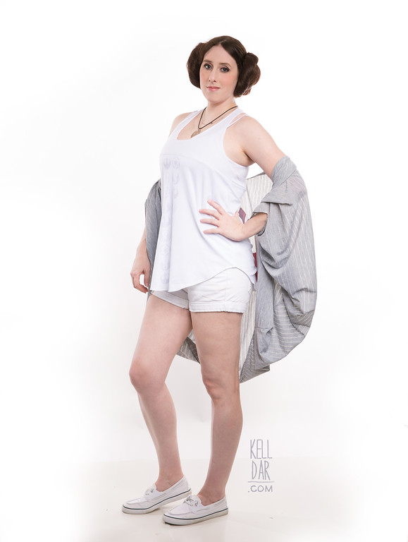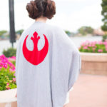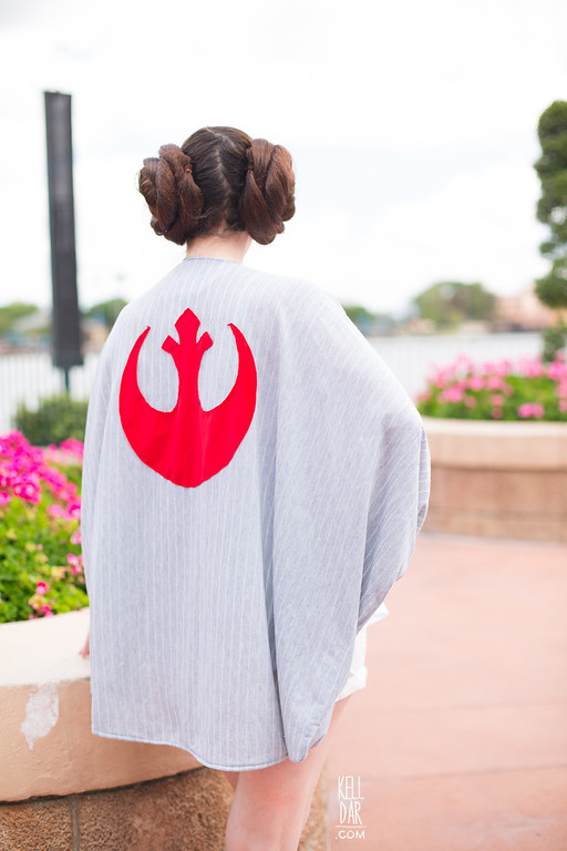 I love my Mighty Fine Captain America Dolman Shrug, but I didn’t think either of their Star Wars options were right for a Leia based costume. I decided to just make something based off of my shrug. I got a light grey knit fabric at Joann Fabrics – I really like it, because it has stripes of metallic silver running through it. Once I had the basic shape together and hemmed, I cut a large rebel symbol out of some leftover red spandex, and hand-stitched it in place on the back — once I had it stitched in place, I went over it on my machine and removed the hand-stitching.