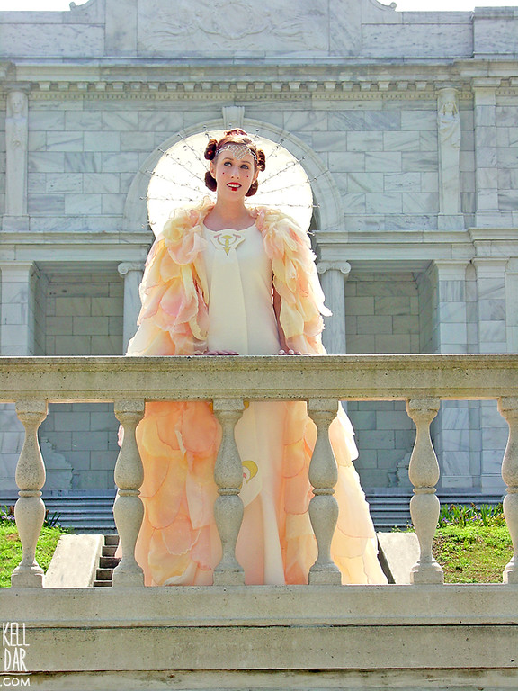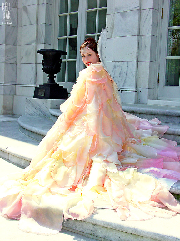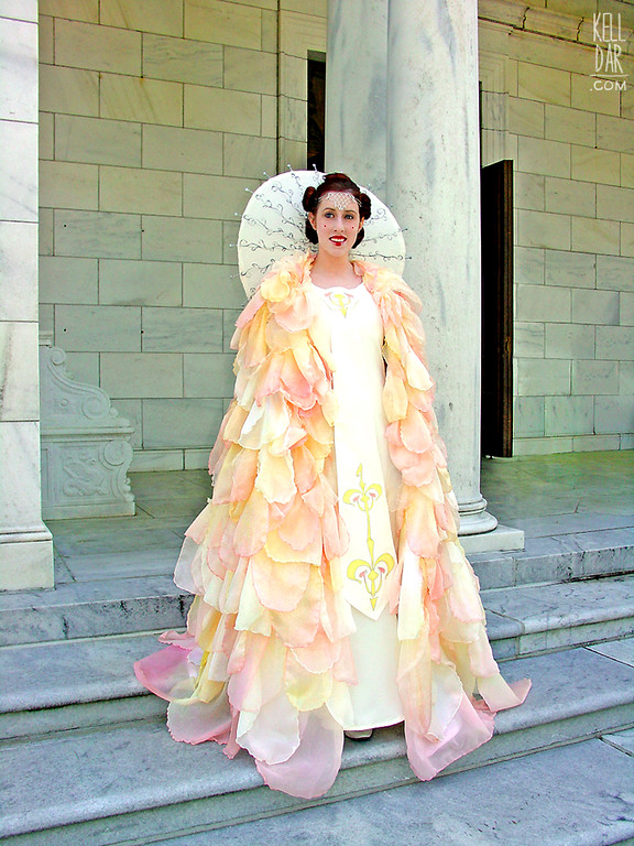 Even though on the original dress, the petals are unhemmed, I wanted my dress to not fray, so I finished the edges on my serger. I cut out petals out of both fabrics – each petal is two layers and each has a rolled edge done on my serger. I dyed each petal in yellow and pink dye, then started attaching them. Ended up having to go back for more organza and chiffon twice – all in all I ended up using over 40 yards of fabric for the cape. Towards the bottom, before sewing the petals on, I sewed layers of netting to help add some body to it. I still dream of sewing those petals on… it went on for forever! Years later I’d still occasionally find a petal I’d missed just pinned on LOL. I sewed arm straps in to hold the cape in place, and also “handles” at the front edge, that I could hold to keep the cape in front of me.